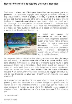 Bref, le bonheur en images immédiates sur votre écran. Le Loto est passé par–là. L’avantage de la toile permet de s’évader à loisirs. Oui, mais pas trop. Faut bien l’éteindre le "machin". Et là: écran noir. On redescend bien vite à la réalité de notre quotidien.